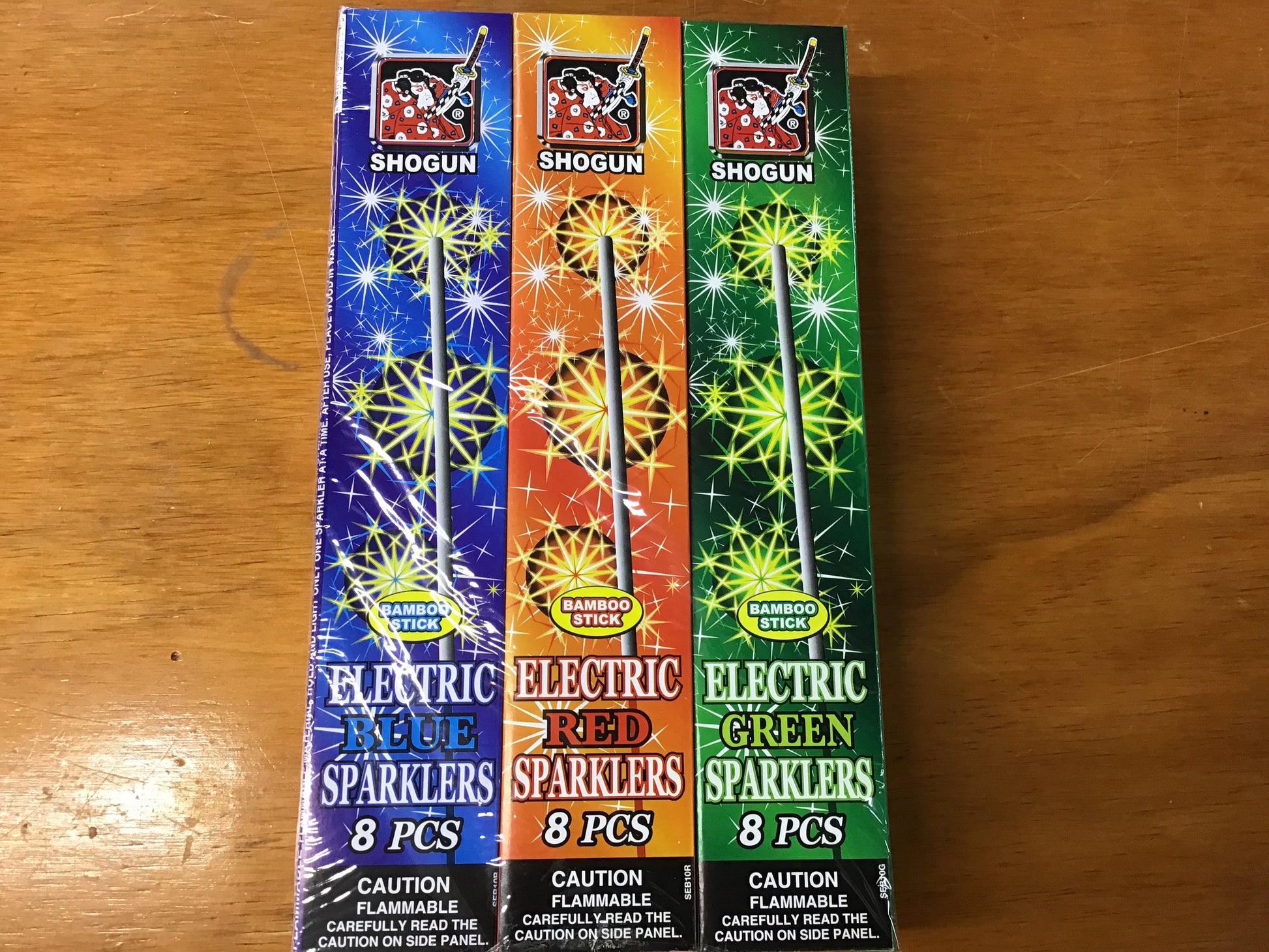 Color WIRE sparklers. 12 packs of 8 sparklers. Red, green and blue. Wire is old school and remains hot after use.