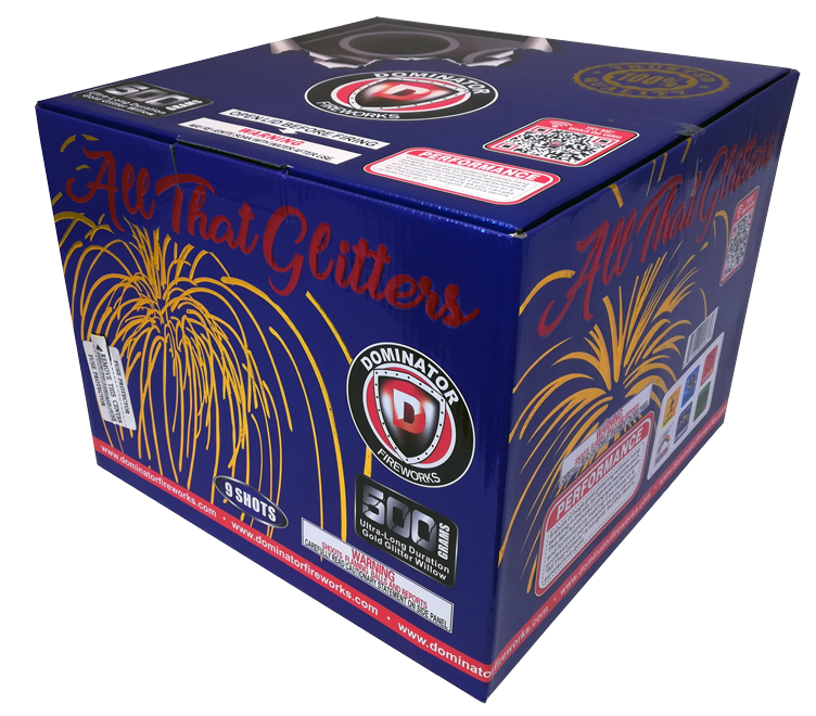 9 shots of huge gold glittering willows hang twinkling in the sky for several seconds.