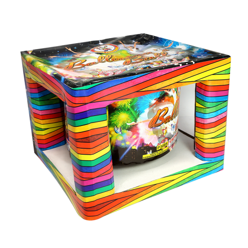 This rotating fountain starts with silver chrysanthemum and transitions to golden pines in the middle with huge spinning red and silver spray. The finale is big-bursting silver chrysanthemums.