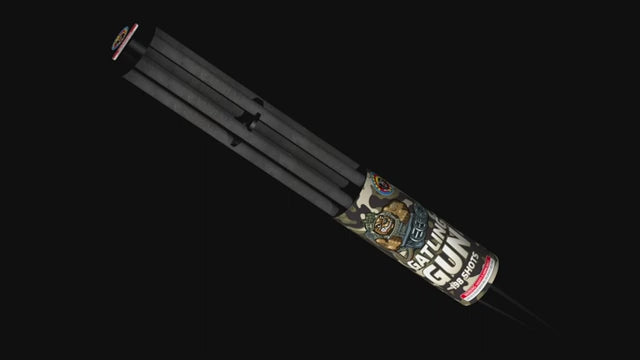 Gatling Gun is an exposed tube mega roman candle that shoots 198 shots of multi-colored pearls to crackling report.