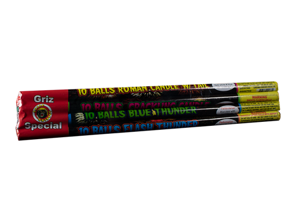 This candle offers an excellent variety of effects. 4 Pack – 10 ball roman candles with assorted effects. 1- Flashing thunder 10 ball with extremely loud report; 2- Blue stars with loud bangs; 3- 10 super crackling balls; 4- Red, White & Blue stars with tail