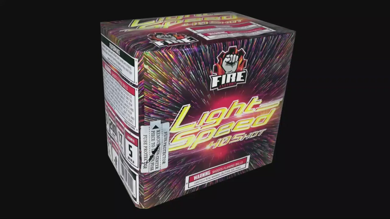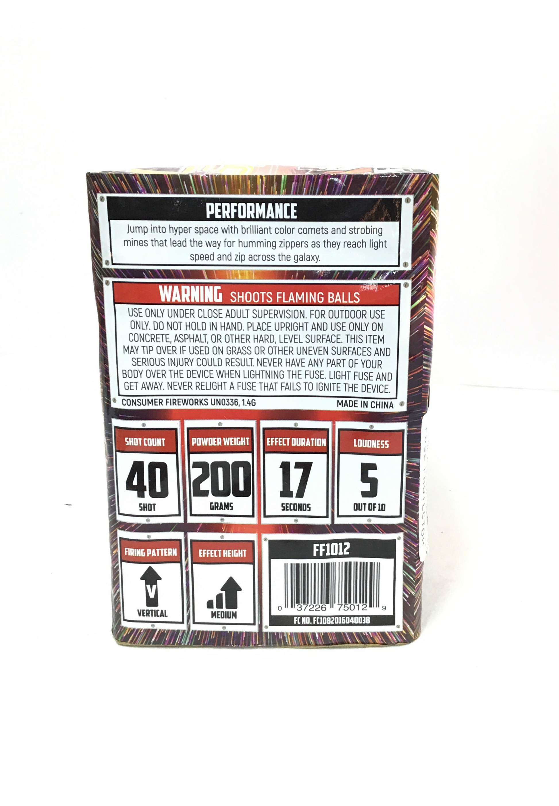 40 shot. Brilliant colored comets and strobing mines leading to humming zippers scattering across the sky. A really unique effect.