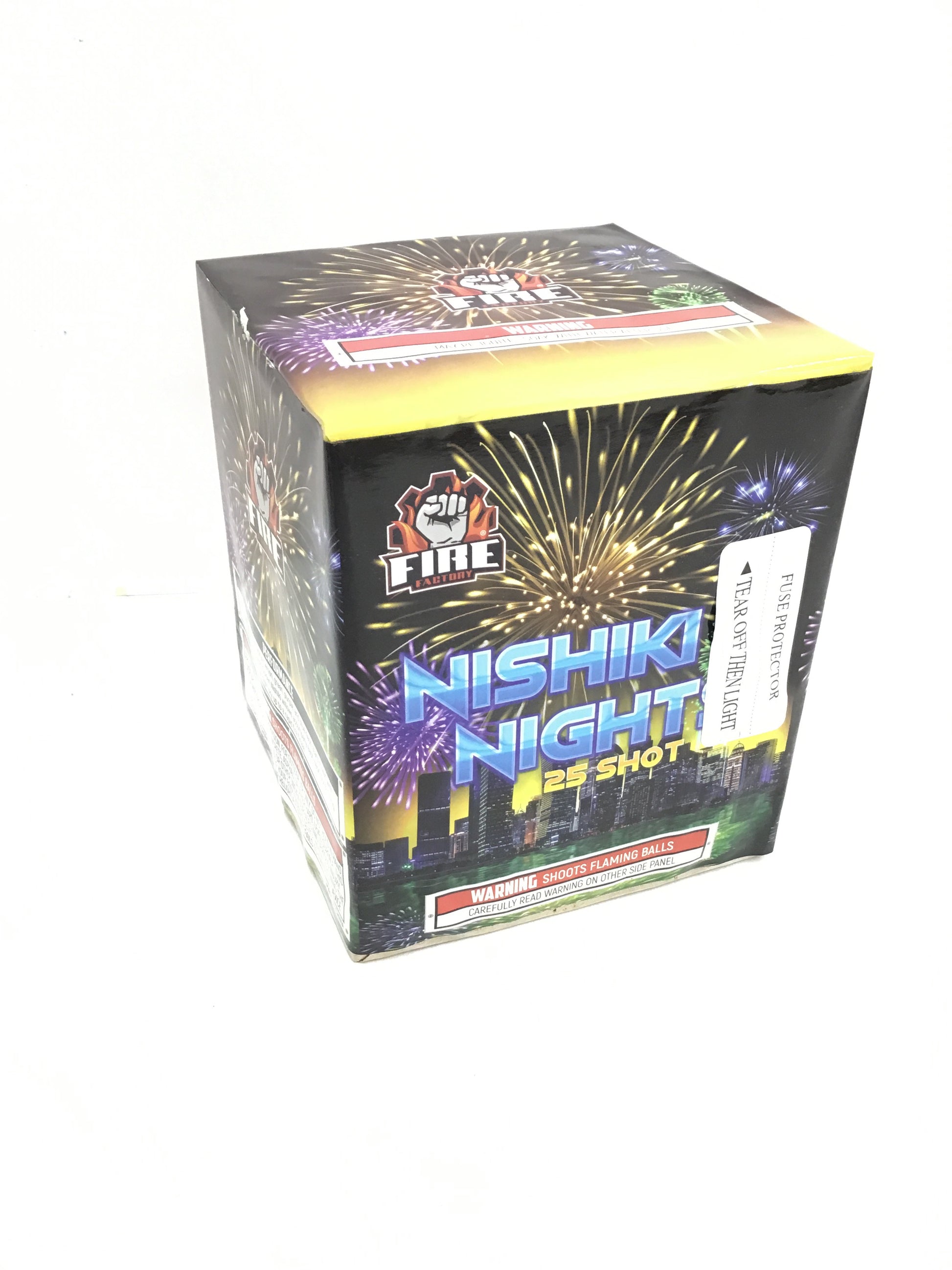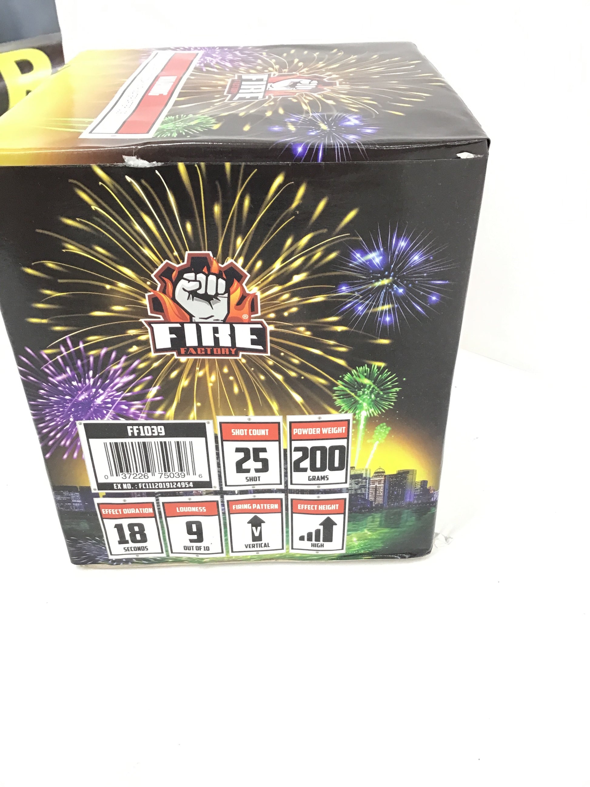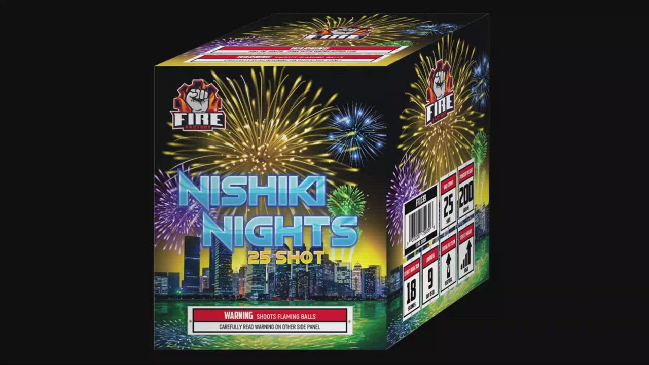 Paint the night sky with 25 shots of vibrant lemon, green, purple, and blue neon stars mixed with dazzling white strobe effects. Golden Nishiki willows accompany each neon burst filling the night sky up to a rapid-fire finale.